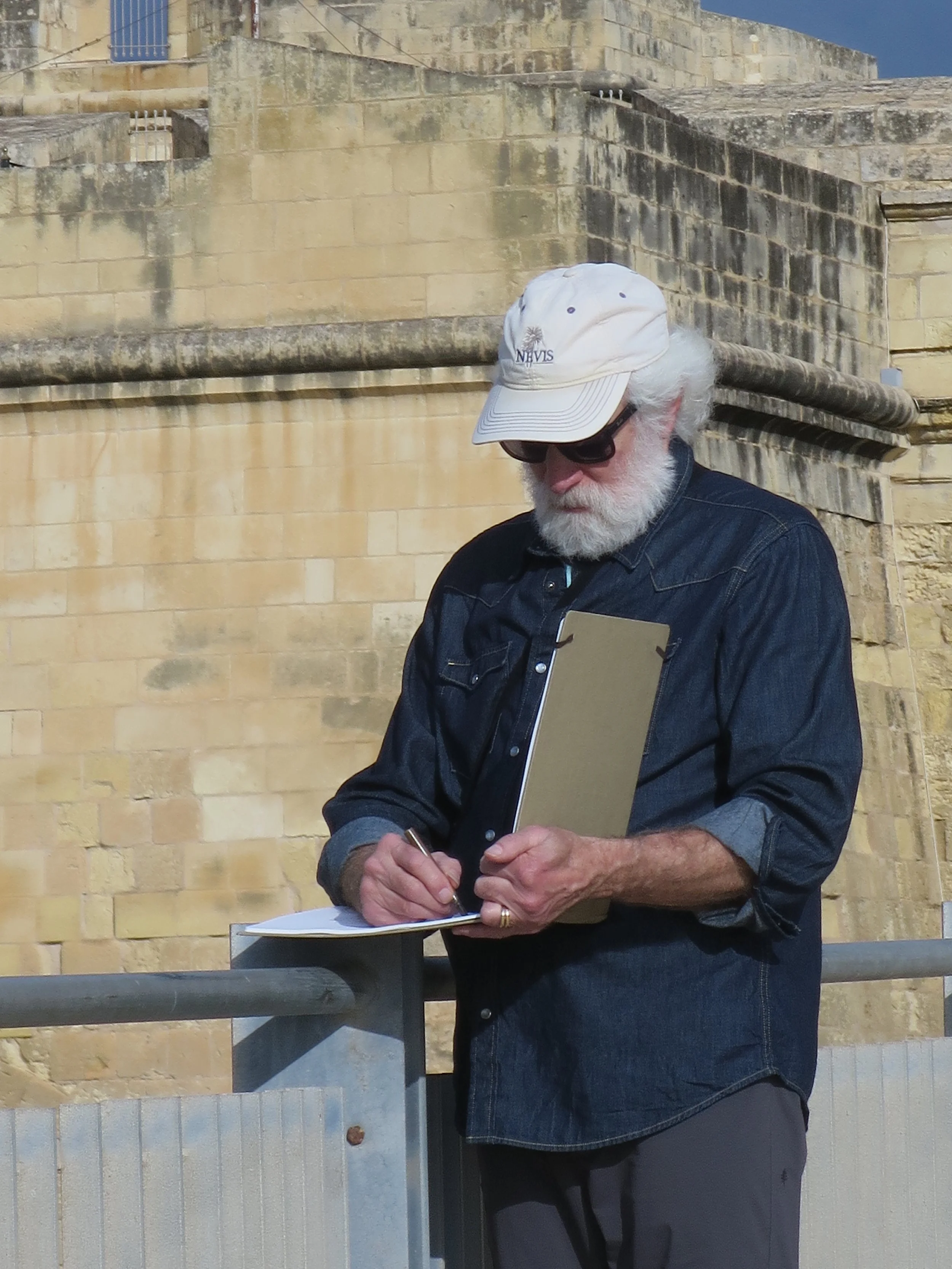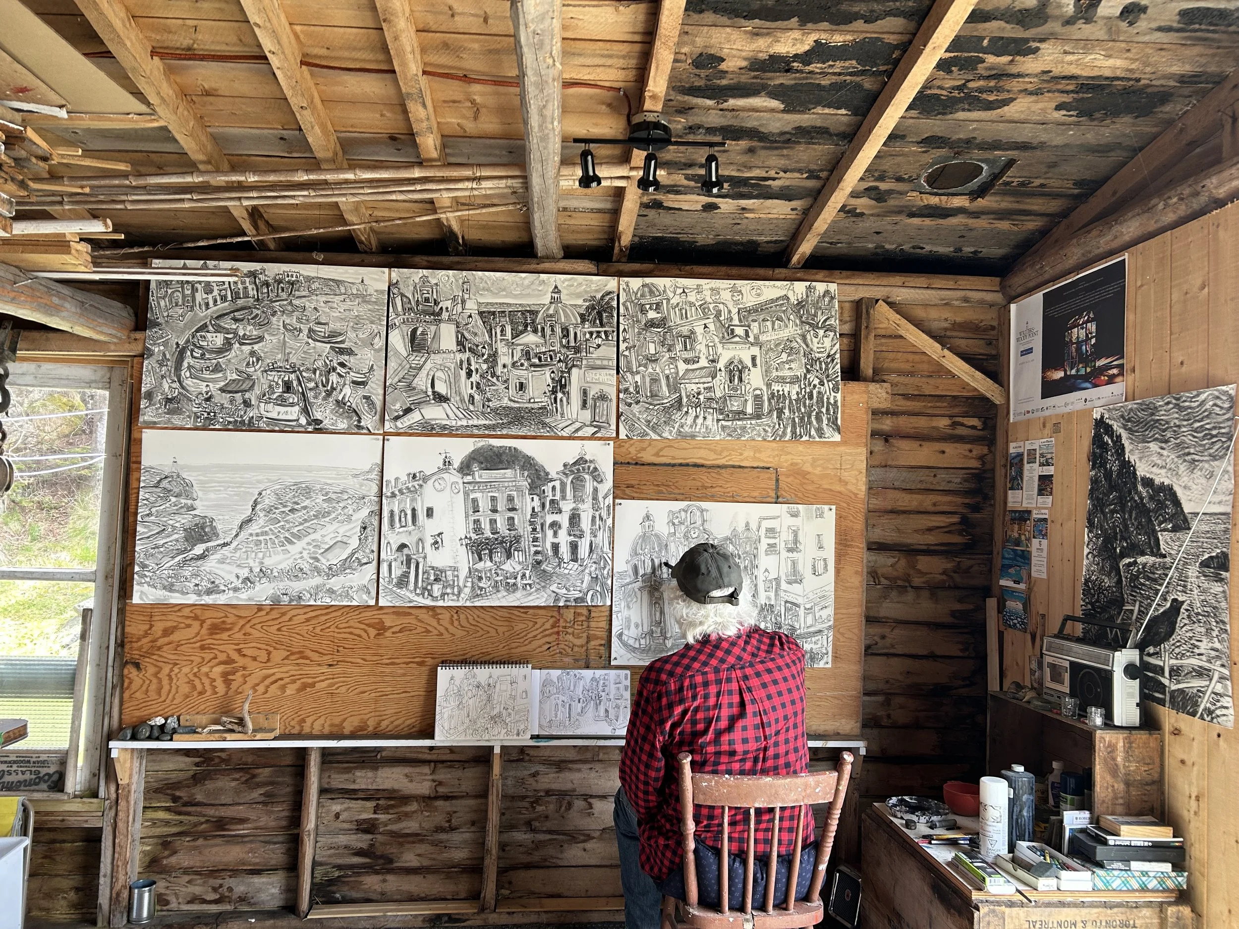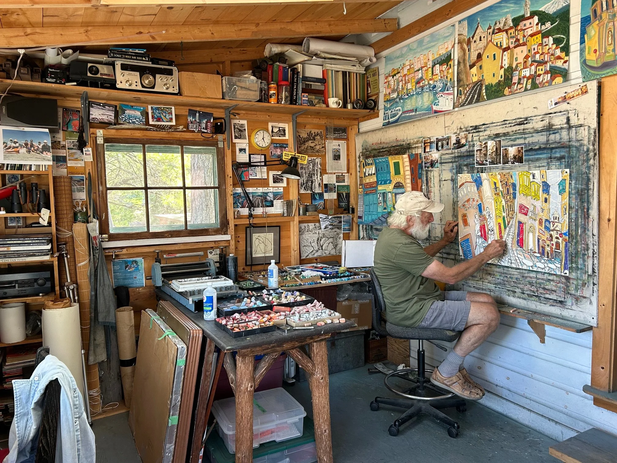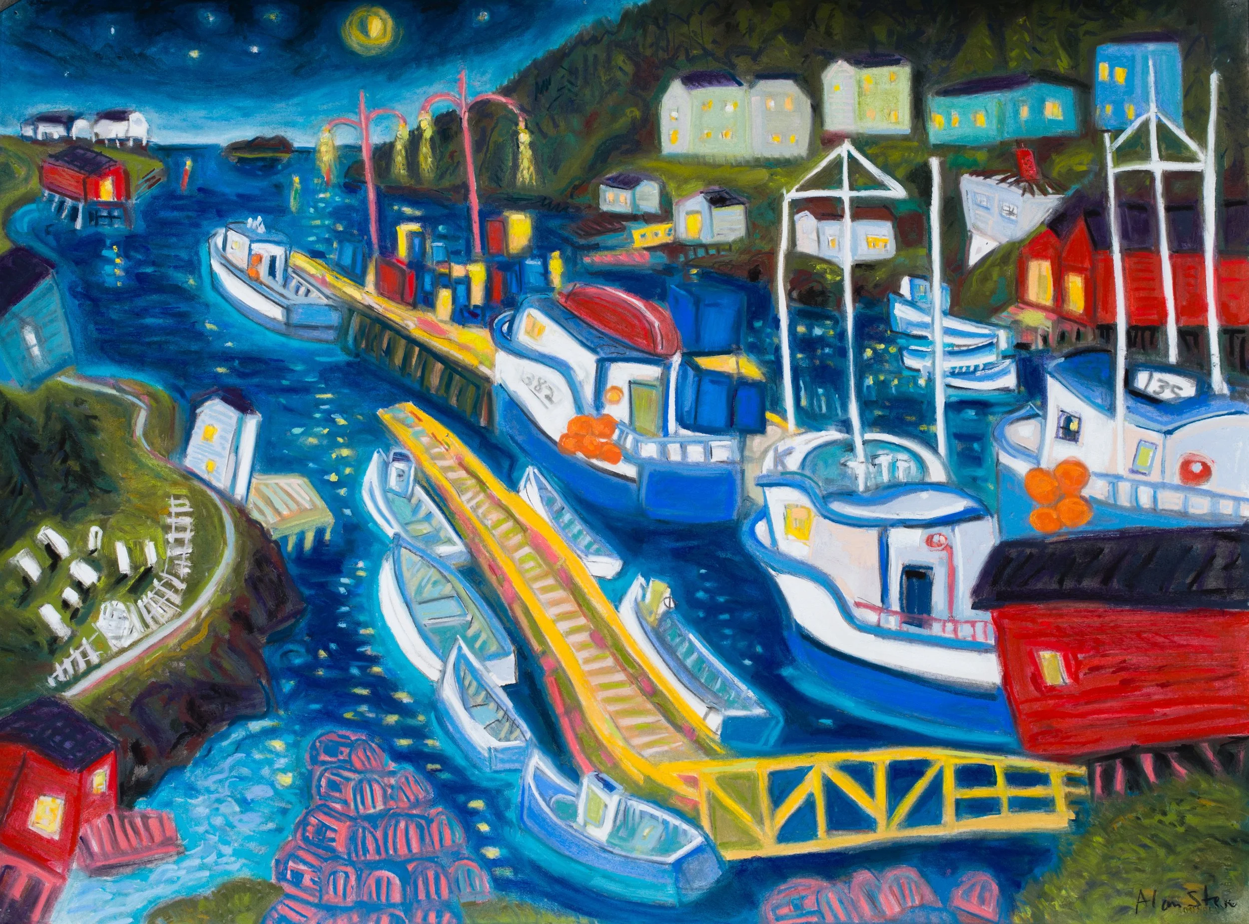 I have been inspired by the harbours up and down the coast, but especially by our working harbour with it’s old buildings, wooden stages, fishing premises, the old cemetery, and the fishing boats of all sizes and colours which come and go, in and out of the harbour. Over the years I have made many on-site sketches and worked those up into paintings, combining different elements and views into an imagined, dreamlike landscape, sometimes visions at night, often with icebergs floating by, lit by the moon and stars.